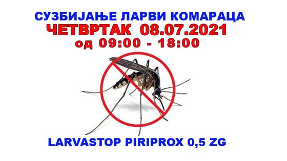Третман ће се вршити препаратом за сузбијање ларви комараца LARVASTOP PIRIPROX 0,5 ZG, који је еколошки препарат на бази регулатора раста са специфичним дејством на ларве комараца и нешкодљив је за водену фауну и остале организме.